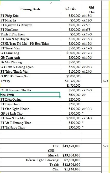 Tổng thu chương trình: 43.670.000vnđ. Tổng chi: 42.500.000vnđ (mua cá, thuê xe, mua đồ cúng...). Còn lại: 1.170.000vnđ, chuyển vào Quỹ Phóng sanh.