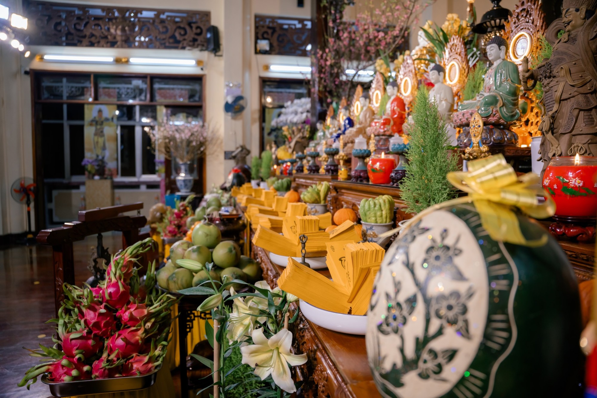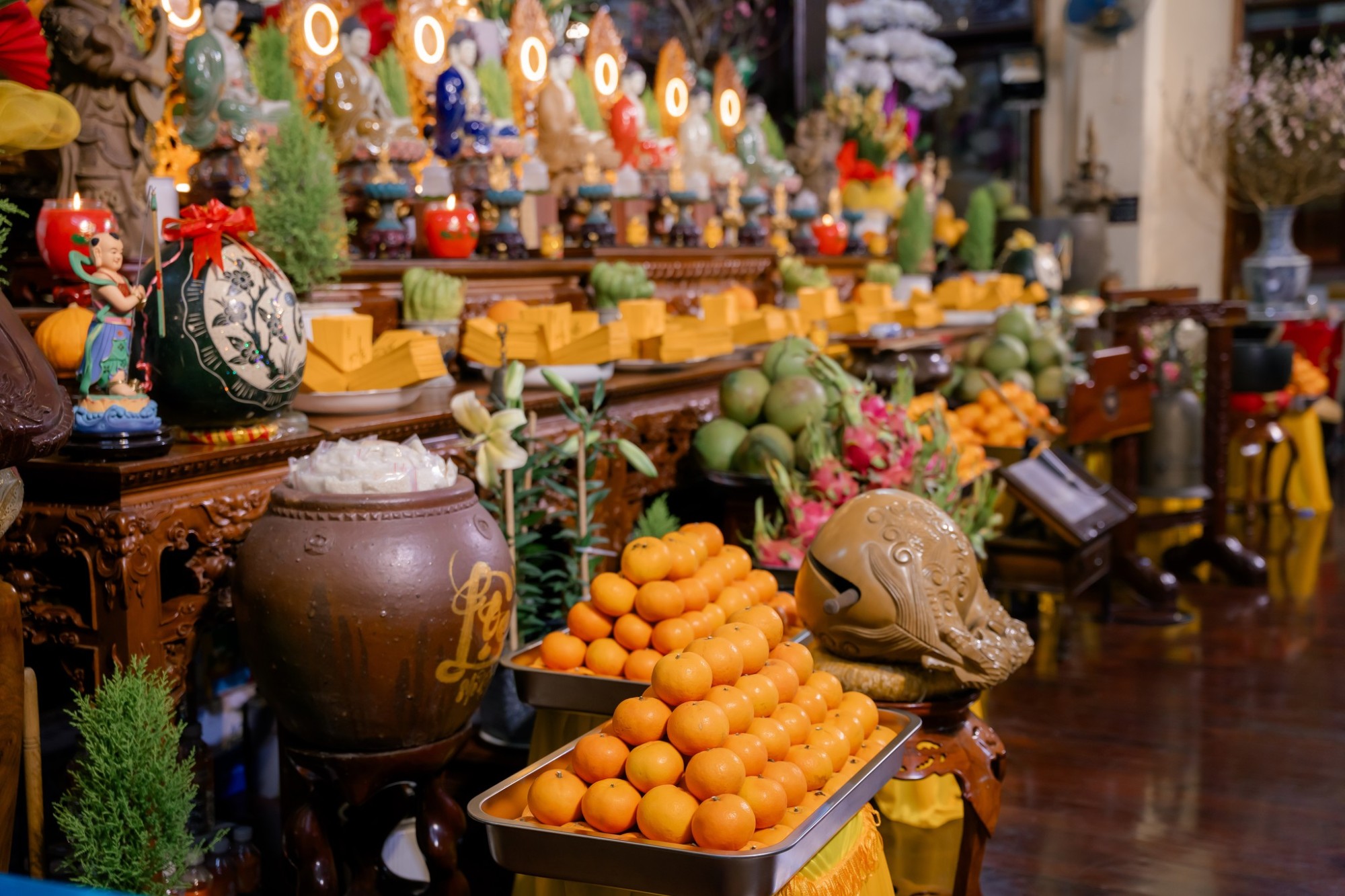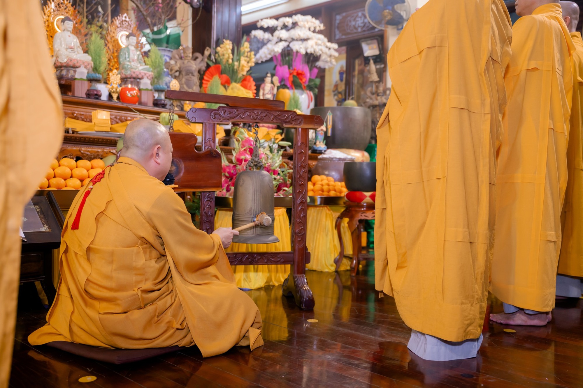 Trong không gian trang nghiêm ấy, hình ảnh những tà áo dài xuân, từ người lớn đến trẻ nhỏ, nhẹ bước lễ Phật càng làm bừng sáng bức tranh xuân nơi cửa thiền, thanh tịnh và ấm áp đến lạ thường.
